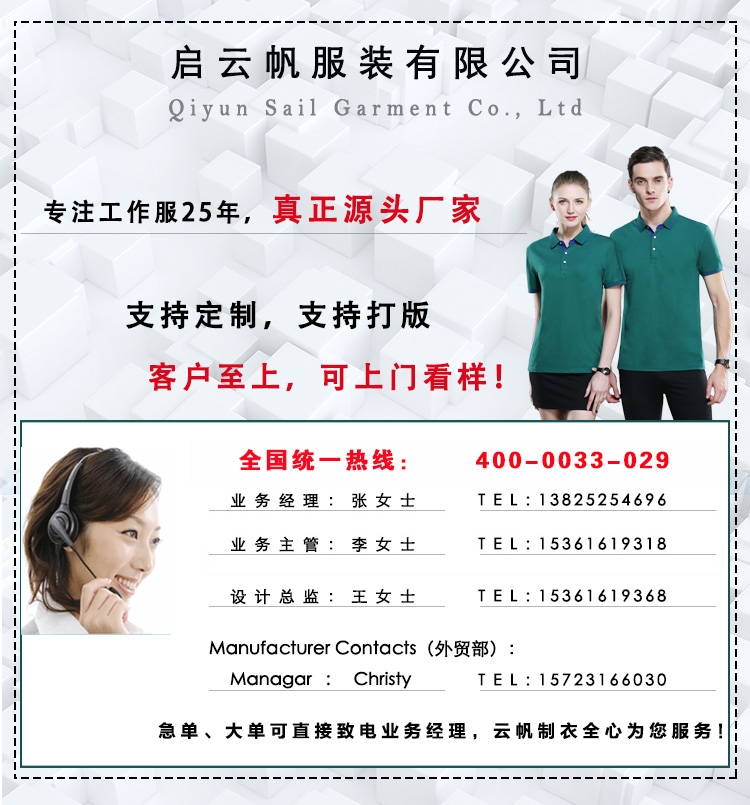 启云帆服装科技有限公司主营工作服、广告衫、文化衫、班服、翻领Polo衫、空白t恤、马甲、广告衫定制、卫衣、冲锋衣、广告帽、工作服t恤、风衣、工作服定制、帽子、广告帽子、工装、劳保服、广告衫 文化衫、diyT恤等。如需购买工作服、广告衫、文化衫、班服、翻领Polo衫、空白t恤、马甲、广告衫定制、卫衣、冲锋衣、广告帽、工作服t恤、风衣、工作服定制、帽子、广告帽子、工装、劳保服、广告衫 文化衫、diyT恤等,请联系我们启云帆服装科技有限公司。