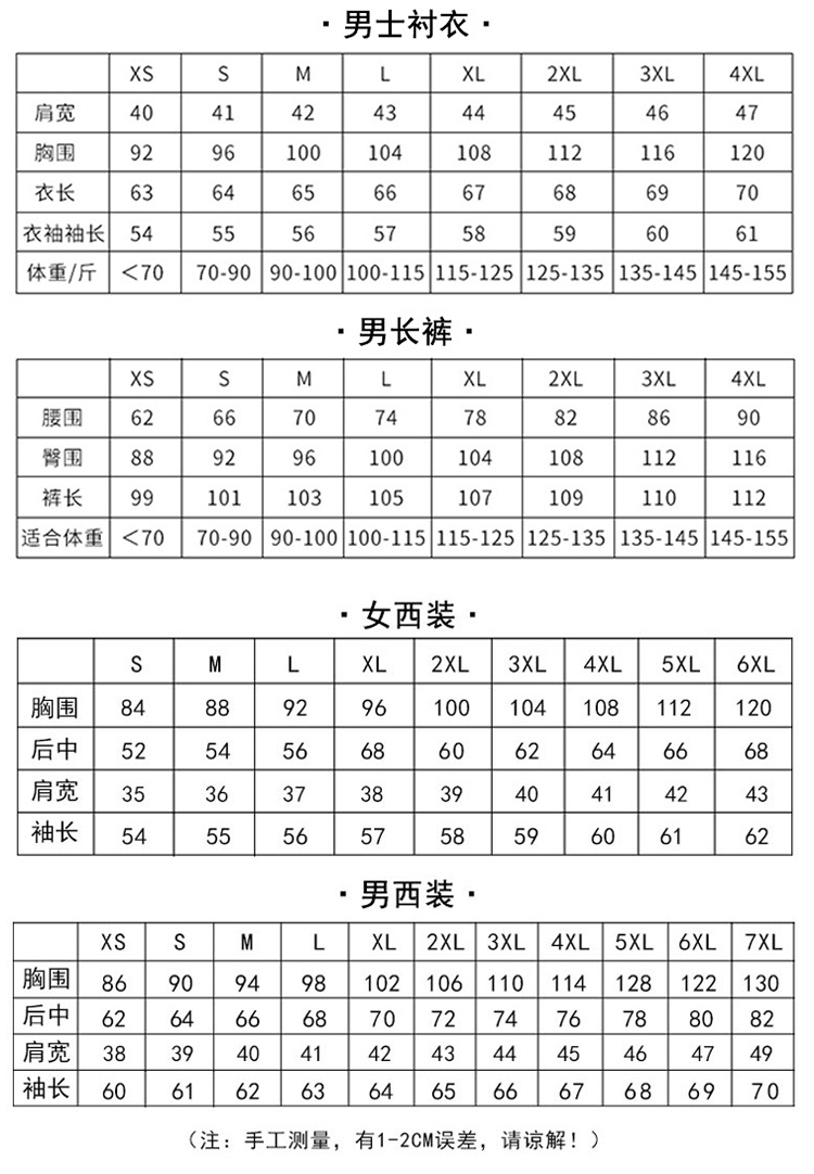 本产品共8个尺码:S、M、L、XL、2XL、3XL、4XL 覆盖99.5%的人群。